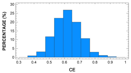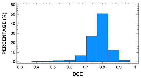 Figure 1 and Figure 2 show the distribution of frequencies obtained for CE and DCE, respectively. The Kolmogorov–Smirnov test proved that both variables adjust to a Gaussian distribution (p > 0.05). The average CE was 0.62, with a standard deviation of 0.09. The minimum and maximum efficiency were 0.39 and 1.00, respectively. About 25% of the sheep included in this study were producing milk at a curd efficiency level below 0.56, while another 25% exceeded an efficiency level of 0.67. By comparison, the average DCE was 0.78, with a standard deviation of 0.06. The minimum and maximum efficiency were 0.40 and 1.00, respectively. Most of the studied sheep were producing milk with efficiency levels within the range 0.73 to 0.88. About 3% of the sheep produced milk with dry curd efficiency levels of less than 0.50%. There are very few published studies focusing on modeling the efficiency of sheep milk performance based on other related parameters. Thereby, it is worth highlighting the paper by Caballero-Villalobos et al. (2018), which established an efficiency model for curd firmness based on coagulation time. The average value for efficiency estimated in the forementioned work is 0.69, with a minimum of 0.33 and a maximum of 1.00. These values are fairly similar to those reported for the present study. Nonetheless, no further bibliography was found to compare or discuss these results.