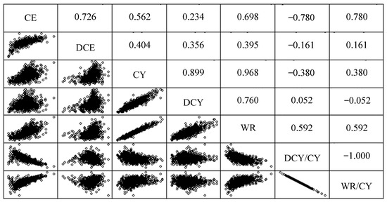 Figure 3 represents the bivariate correlation pattern between variables related to curd yield. The positive correlations between DCY, water retained in the curd (WR), and CY are obvious and evident because the sum of the first two variables results in the latter. However, CY is more strongly correlated with WR than with DCY, and the dispersion pattern contains less variability. Correlations between these variables and the ratio of water (WR/CY) and dry matter (DCY/CY) in curd evidence that WR/CY tends to increase with CY (and DCY/CY tends to decrease proportionally). Therefore, from a technological point of view, this increase in curd yield due to higher water retention should not be considered a “true” improvement, since the higher yield is due to an increment of the percentage moisture and not an increase in cheese solid components. CE and DCE are positively correlated. However, the impact of DCE on CE is more intense at low levels of CE than at high levels, as suggested by the dispersion pattern. This means that the influence of milk composition (DCY) is more important at lower CE and that higher levels of CE are due to a greater retention of water in the curd. The evidence of correlation between CE and DCE has methodological implications for the study of causes of inefficiency. According to Wang et al. [19], if the specific correlation pattern between two or more dependent variables is not taken into account, this test may not be able to identify significant effects. At a practical level this can be solved by complementing the typical unidirectional approach for each dependent variable with a multivariate approach in the analysis of variance that can help differentiate, in a more specific way, which factors optimize coagulation efficiency, as well as the parameters that determine its inefficiency.