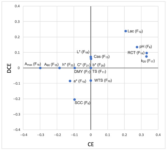 According to studies performed in dairy cows [3] and studies comparing dairy cows and sheep [1], milk coagulation properties and curd yield are not so much affected by milk composition as expected, which is evident in the DCE model. However, the CE model shows that the most efficient milk samples correspond to those with a more alkaline pH (r = 0.27), longer RCT (r = 0.33), higher k20 (r = 0.33), and lower Amax (r = −0.30). These values would correspond to milk with “worse” coagulation parameters, resulting in a softer and more hydrated curd and poor drainage. Again, the CE model seems to be conditioned by the percentage of moisture retained in the curd, in agreement with Johnson et al. [27], who associated slow RCTs with an increase in moisture in the curd.