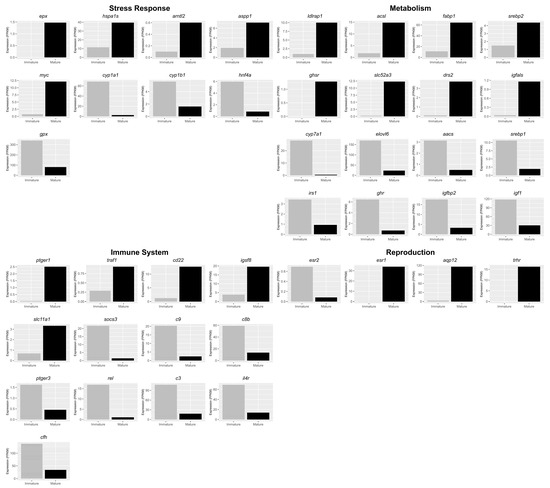 DEGs analysis between livers of immature (n = 3) and mature (n = 3) females. Bar plot shows gene expression levels (FPKM) of genes involved in metabolism, immune system, reproduction and stress response. y-axis indicates the FPKM level.