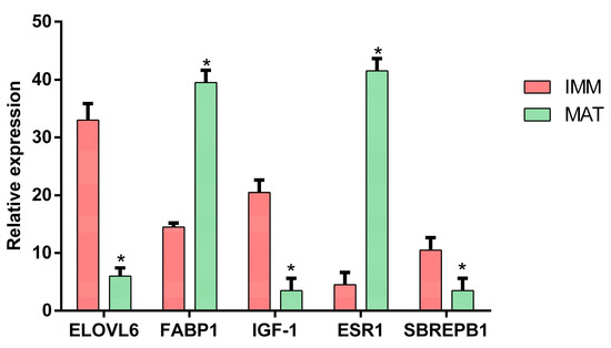 qPCR validation. Bar plot shows gene expression levels of five genes, measured by qPCR between livers of immature (n = 3) and mature (n = 3) females. Significance between mature and immature for each gene is shown by an asterisk, and standard error is reported with error bars.