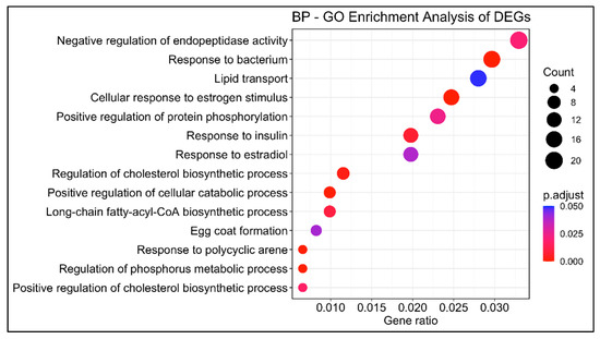 Using the reference genome of swordfish and the empirical Bayes estimation and exact tests based on a negative binomial model, a total of 750 differentially expressed genes (DEGs) were identified between immature and mature females: 355 upregulated and 395 downregulated. The GOEA (gene ontology enrichment analysis) identified fourteen enriched biological processes, including lipid transport (GO:0006869), response to estradiol (GO:0032355), response to bacterium (GO:0009617), egg coat formation (GO:0035803) and response to polycyclic arene (GO:1903165) (Figure 3).