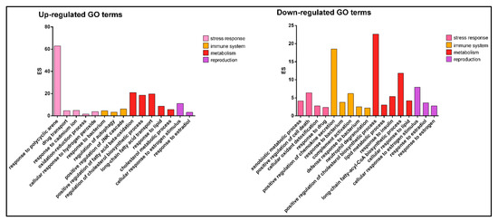 The up- and downregulated GO terms examined based on their role in immune system, metabolism, reproduction and stress response. y-axis indicates the enrichment score (ES); x-axis indicates the GO term description. The colors indicate the processes examined.