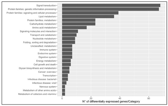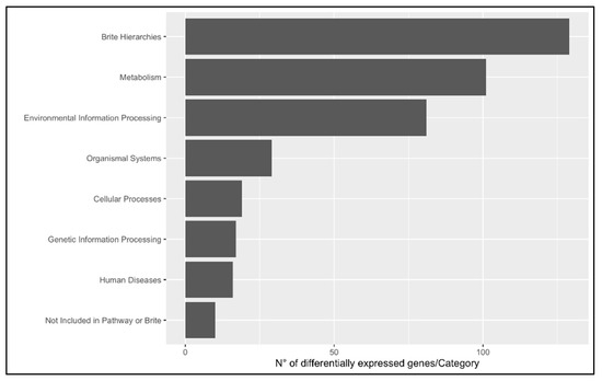 KEGG BRITE functional hierarchies analysis category A (macro category). The bar plot shows in x-axis the number of DEGs per macrocategory between livers of immature (n = 3) and mature (n = 3) females; y-axis indicates the pathway description.