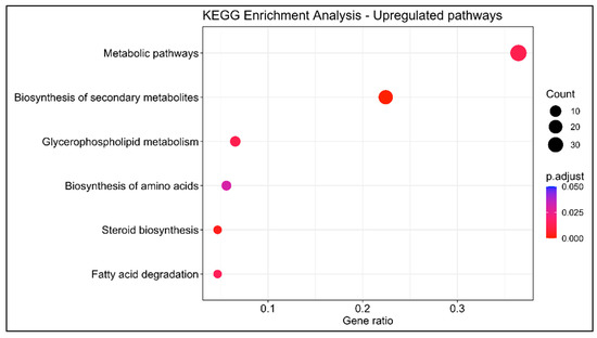 KEGG enrichment analysis of differentially upregulated genes between livers of immature (n = 3) and mature (n = 3) females. y-axis indicates the pathway description; x-axis indicates the gene ratio. The size of the dot is based on gene count, and the color of the dot shows the GO term’s enrichment significance (p-adjust < 0.05).