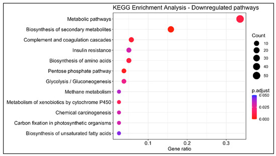 KEGG enrichment analysis of differentially downregulated genes between livers of immature (n = 3) and mature (n = 3) females. y-axis indicates the pathway description; x-axis indicates the gene ratio. The size of the dot is based on gene count, and the color of the dot shows the GO term’s enrichment significance (p-adjust < 0.05).