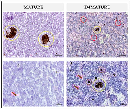 Photomicrograph of the immature and mature liver of Xiphias gladius. Hematoxylin and eosin (H&E) staining of a section of the liver shows lipid components (red arrow); melanomacrophage center presence (yellow circle); single melanomacrophages (red circles).
