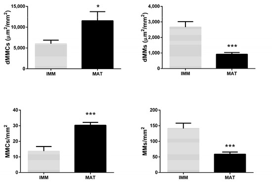The density of MMCs showed a significant increase in mature females compared to immature females (p-value < 0.05), while the density of MMs showed a strong significant decrease in mature females with respect to immature females (p-value < 0.001). The number of MMCs per mm2 liver parenchyma showed a strong significant increase in mature females compared to immature females (p-value < 0.001), while the number of MMs per mm2 showed a strong decrease in mature females compared to immature females (p-value < 0.001) (Figure 10).