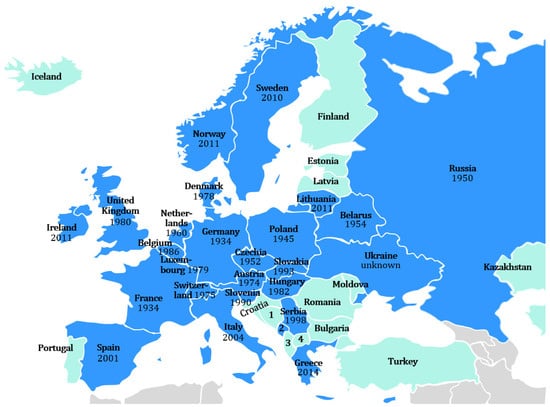 European distribution of raccoons (blue: raccoons detected, green: no raccoons detected, gray: non-European country, not considered). A state is defined as a distribution area of raccoons, regardless of the abundance and distribution of the raccoons within the state territory. The year indicates the first detection of raccoons in a national territory. Abbreviations: 1: Bosnia and Herzegovina, 2: Montenegro (1998), data collected before the independence of Montenegro and therefore no separation between Serbia and Montenegro, 3: Albania, 4: Northern Macedonia [3,31,34,35,42,46,47,48,49,50,51,52,53].
