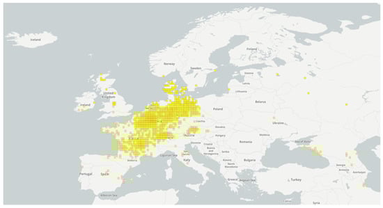 Occurrence of the raccoon in Europe. Detection of animals from 2000 to 2022 (yellow dots). Analysis and visualization of d“Procyon lotor (Linnaeus, 1758)” using the Global Biodiversity Information Facility (GBIF) in November 2022 (https://www.gbif.org/species/5218786; accessed on 18 November 2022). Basis of records: observation, machine observation, human observation, material sample, material citation, and preserved specimen.