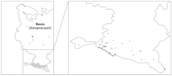 Occurrence of the raccoon in the European part of Russia (dark grey dots). Raccoons are repeatedly spotted in European Russia (left). However, the main populations are located in the Caucasus and on the Black Sea coast of the extreme southern part of European Russia (right). Distribution data were obtained from the Mammals of Russia portal (https://rusmam.ru/atlas/map; accessed on 18 November 2022)) in November 2022.