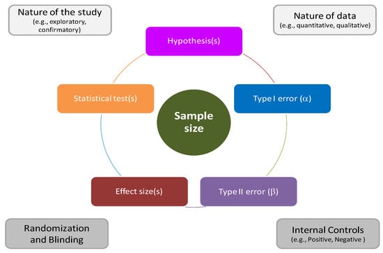 Once the above-mentioned factors are defined, the next steps are represented by the formal sample size estimation (Figure 1, middle part). Briefly, researchers have to define the hypothesis system, i.e., the null (H0) and alternative (H1) hypotheses; the latter can be one-sided or two-sided. In parallel, the level of Type I and II errors should be defined: the first one represents the probability of rejecting H0 when it is true (i.e., false positives results—α level), whereas the second one represents the probability of not rejecting H0 when it is false (i.e., false negative results, β level). The complement of Type II error is called statistical power (γ = 1 − β). The last two components that should be defined—according to the nature of the variable(s)—are the statistical test to be implemented and the corresponding effect size, i.e., the smallest difference that we want to detect at the chosen α level. All these inputs are fundamental ingredients for a formal estimation of the sample size.