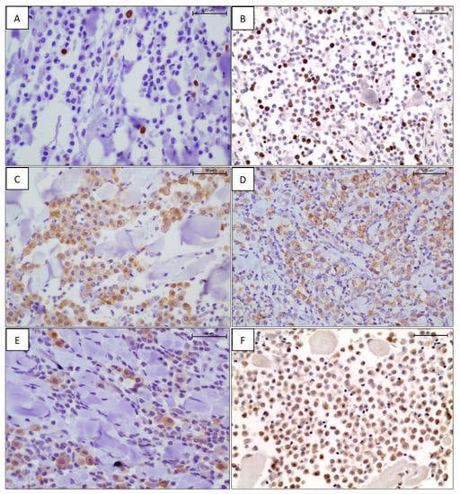 Samples incubated with Ki-67 were considered positive when the nuclei of mitotic cells showed immunohistochemical staining. Ki-67 index was assessed in all samples using a 1 cm2 grid reticle (10 × 10 mm) at 400× g. The number of positive cells per grid area was assessed upon highly proliferative areas in 5 HPF and subsequently averaged, as previously reported [29].