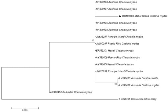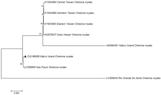 The phylogenetic tree reveals that the ChHV5 Mabul Island isolates are clearly grouped with other ChHV5 isolates from other regions, verifying the identity of the Mabul Island isolates. Furthermore, there are no clear geographical clusters of the ChHV5 isolates, indicating that the ChHV5 Mabul Island isolates are similar to different isolates from different regions such as Brazil, Florida, Hawaii, and Puerto Rico. We also noticed that for the UL18 sequence, the newly obtained sample from Mabul (OQ189658) was not grouped with the ChHV5 strain (MG894351) that was obtained in 2015. This information suggests that there is no clear demarcation of the ChHV5 lineage based on the geographical regions, as was also observed in Li et al. [4]. However, this must be further verified since the sequence obtained for UL18 is relatively short. A longer region ought to be analyzed (or whole viral genomes) to determine the strain or lineage of the ChHV5 detected in the samples collected from Mabul Island. Nevertheless, if the ChHV5 is in fact from a common strain, this could be due to the wide range of movements (i.e., migration) of the sea turtles, as reported previously elsewhere [7,26,27]. Several studies have examined the possible route of transmission of ChHV5 [27,28,29]. Three types of samples (skin tissue, tumor tissue, and swab samples (ocular, nasal, and cloacal)) were collected to study the transmission of the virus [27]. The results revealed that the ChHV5 DNA was detected in the swab samples, which supports the possibility of a horizontal transmission route of the virus through the excretion and secretion of bodily fluid [27]. The migratory nature of sea turtles begins when the turtle hatchlings undertake long-distance migrations, following oceanic currents and eventually settling down in coastal waters as juveniles [30]. The migration of adult turtles can span thousands of kilometers between breeding/nesting grounds and foraging grounds. Hence, healthy sea turtles may come into contact with infected sea turtles during this long-distance migration period, or when they congregate at foraging grounds where they spend long periods of time [31]. A study conducted in Queensland, Australia, showed that the six distinct variants of ChHV5 were associated with host foraging grounds, and no association was found between host genetic origins. Thus, these findings further support the horizontal transmission of ChHV5 among sea turtles at foraging grounds, and less likely at rookeries [29]. Moreover, it is also believed that marine leeches (Ozobranchus spp.) play a role in the distribution of the ChHV5 worldwide [32,33,34,35]. A study on parasites affecting sea turtles in Hawaii [32] found that the Ozobranchus margoi carries high viral DNA loads. This finding seems to suggest the role of marine leeches as a mechanical vector for ChHV5 [32]. Therefore, the global distribution of the ChHV5 can be explained by the long-distance migration period of the sea turtles and the role of marine leeches as the mechanical vector for ChHV5. However, no marine leeches were observed on the captured sea turtles in the present study.