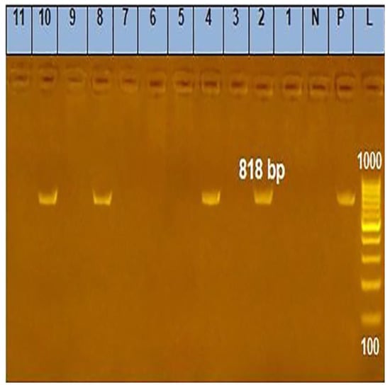 Agarose gel electrophoresis (1.5% and stained with ethidium bromide) showing the amplified 16S rRNA gene of the isolated C. pseudotuberculosis. Lane (L): DNA molecular weight ladder (100 bp ladder); lane (P): positive control for the C. pseudotuberculosis 16S rRNA gene; lane (N): negative control for the C. pseudotuberculosis 16S rRNA gene; lanes (2, 4, 8, and 10): Positive results for C. pseudotuberculosis 16S rRNA gene (specific band at 818 base pairs); lanes (1, 3, 5, 6, 7, 9, and 11): negative results for C. pseudotuberculosis 16S rRNA.
