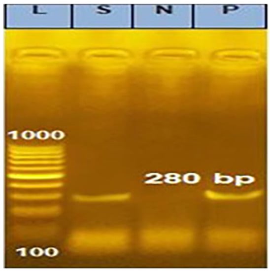 Agarose gel electrophoresis (1.5% and stained with ethidium bromide) for detection of integron gene in C. pseudotuberculosis isolate showed resistance to 6 classes of antibiotics. Lane (L): DNA molecular weight ladder (100 bp ladder); lane (S): positive result for integron gene (specific band at 280 bp); lane (N): negative control for integron gene; and lane (P): positive control for integron gene.