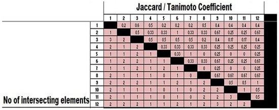 Similarity index (Jaccard/Tanimoto Coefficient and the number of intersecting elements) between 12 isolates of investigated C. pseudotuberculosis.