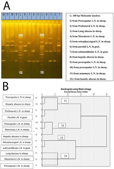 Isolates 2, 6, 9, and 12 of C. pseudotuberculosis were obtained from the prefemoral L.N. in sheep, the parotid L.N. in goats, prescapular L.N. in sheep, and hepatic abscess in sheep were clustered with a 7% dissimilarity in the same cluster (C1). Similarly, isolates No. 8, 10, and 11 isolated from a hepatic abscess in sheep, prescapular LN in sheep, and mammary LN in sheep, respectively, were clustered together (C2) with a dissimilarity of 4%. Isolates No. 5 and 7 isolated from retropharyngeal LN in sheep and submandibular LN in goats, 0.05 mg/mL, were also shown in the same cluster with a dissimilarity of 1%; and isolates No. 1, 3, and 4 isolated from prescapular LN in sheep, lung abscess in sheep, and mesenteric LN in sheep, respectively, were clustered in the same group (C4) with a dissimilarity of 7%. The two clusters (C1 and C2) differ from the other two clusters (C3 and C4) by approximately 25% as shown in Figure 3 and Figure 4.