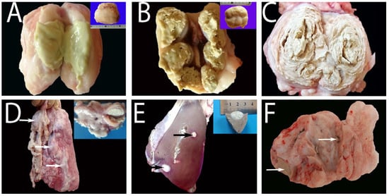 Examined lymph nodes demonstrated marked enlargement (3–10 cm) with either thick creamy green pus (Figure 5A) or multiple abscesses consisting of a central caseated core surrounded by dense fibrous connective tissue capsules (Figure 5B). Some lymph nodes exhibited concentric lamellated layers or an onion-like appearance in cross-sections, which is pathognomonic pattern of CLA (Figure 5C). Similar lesions of variable-sized abscesses were randomly distributed throughout numerous internal lymph nodes as mediastinal LN and other parts of the body, especially in the lung (Figure 5D), liver (Figure 5E), and MG (Figure 5F) in sheep and goat carcasses.