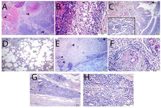 H&E-stained photomicrograph of corynebacterial lesions in sheep. (A) Center of corynebacterial pyogranuloma in liver displaying caseous necrotic mass, bacterial colonies, multifocal calcification (arrowheads), pus cells, and intense mononuclear cells infiltration. (B) The periphery of a corynebacterial pyogranuloma in the liver displaying the organization of chronic inflammatory cells in three layers: a layer of the pyogenic membrane (N) surrounding necrotic material, a macrophage layer (M), and a lymphocytic layer (L). (C) Lung section demonstrating suppurative bronchopneumonia with epithelial necrosis and desquamation (arrow), with prominent neutrophilic infiltration within alveoli visible in the inset. (D) Lung section demonstrating the development of a giant alveolus (GA) surrounded by atelectatic alveoli (*). (E) A hepatic section demonstrating multiple foci of portal fibrosis, ductular reaction, and neutrophilic and lymphocytic infiltration (arrowheads). (F) A hepatic section demonstrating interface hepatitis with separation of hepatic plates, vasculitis, portal fibrosis, and formation of newly formed bile ductules. (G,H) Mammary section showing diffuse and complete acinar destruction, intraductal and interstitial mononuclear infiltrates (*) and interstitial fibroplasia (F). (A,C–E,G) scale bar = 100 µm, (B,F, inset C,F) scale bar = 50 µm.
