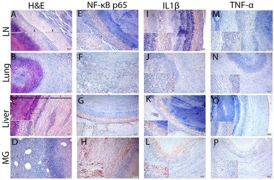 The expression of NF-κB, IL1β, and TNF was determined using a standard horseradish peroxidase immunohistochemical technique. Briefly, 4–5 μm deparaffinized sections of LNs, lung, liver, and MG were mounted on positively charged slides and pre-treated with 3% H2O2 to inhibit endogenous peroxidase activity. Slides were microwaved for 10 min in 10 mM sodium citrate buffer (pH 6.0) to retrieve antigen. DAKO Corporation’s monoclonal antibodies for NF-κB/p65, IL1β, and TNF, DAKO Corp. were applied to slides and incubated overnight at 4 °C in a humid chamber. Then, a secondary biotinylated antibody was applied, followed by 3,3′-diaminobenzidine tetrahydrochloride incubation (DAB). After each step, sections were washed with phosphate buffer saline three times. After dehydration and DPX mounting, sections were stained with diaminobenzidine chromogen solution and counterstained with Mayer’s hematoxylin [33].