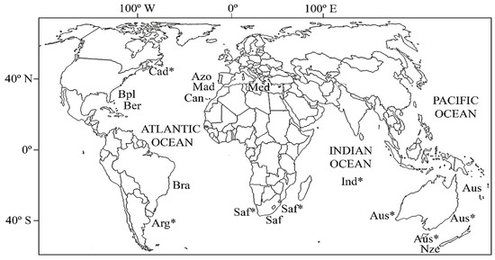 Sampled regions of Polyprion americanus: Arg*, Mar de Plata (Argentina); Aus, Northwestern Australia; Aus*, Australia (from east to west: New South Wales, Tasmania and Western Australia); Azo, Azores; Ber, Bermuda; Bra, Brazil; Bpl, Blake Plateau; Cad*, Canada; Can, Canary Islands; Ind*, South Indian Sea; Mad, Madeira; Med, Mediterranean Sea; Nze, New Zealand; Saf, South Africa; Saf*, South Africa (Atlantic ocean and Indian Ocean). Asterisks indicate samples which COI sequences were retrieved from BOLD database.