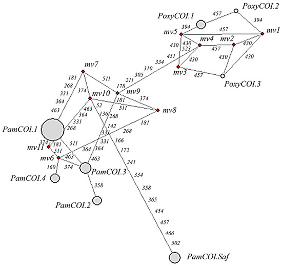 Median-joining network showing the mutational distance among mitochondrial DNA COI haplotypes from P. americanus (PamCOI) and P. oxygeneios (PoxyCOI) (see Table 2 above for sequence data). Median vectors (mv, in red dots) indicate likely extant but non-sampled sequences. The diameter of circles indicates the relative frequency of each haplotype.