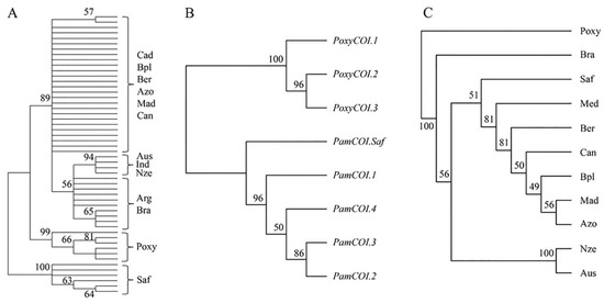 (A) Maximum likelihood phylogenetic tree on COI sequences (log-likelihood −1109.4004) implemented with the HKY+G model of substitution. The percentage of trees in which the associated taxa clustered together is shown next to the nodes. Bootstrap values less than 50% are not shown; (B) Neighbor-joining dendrogram built with eight COI haplotypes from P. americanus and P. oxygeneios. Percentages of trees with the same clustering out of 10,000 resampled trees are shown on nodes. Bootstrap values less than 50% are not shown; (C) Neighbor-joining dendrogram based on the chord distance from the allele frequencies of microsatellites. Percentages of trees with the same clustering out of 10,000 resampled trees are shown on nodes.