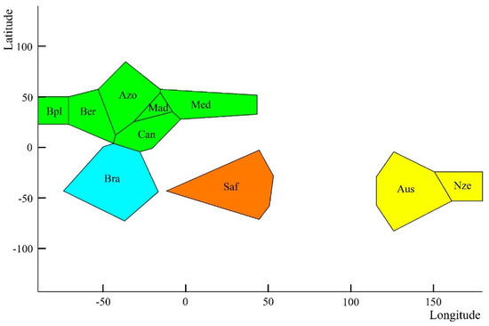 The number of alleles per locus ranged between 14 (locus PamD1) and 25 (locus Pam006). The four microsatellites were polymorphic in all samples except marker PamD1 in the Mediterranean (Figure S1). The putative frequencies of null alleles were generally below 0.10 except seven cases over that figure but not ascribed to a specific locus or to a population. Modal alleles were distinct among samples, e.g., marker PamD1 showed a modal size of 171 bp in the Atlantic North but 175 bp in Oceania (Figure S1). Samples from Bermuda (Ber), Madeira (Mad), Mediterranean Sea (Med), South Africa (Saf), Australia (Aus), and New Zealand (Nze) were in Hardy–Weinberg equilibrium (HWE) in all markers, while samples from Black Plateau (Bpl), Azores Islands (Azo), and Brazil (Bra) showed heterozygote deficit in some loci (Table S1). The most likely number of gene pools retrieved from the Bayesian admixture analysis of BAPS (k = 1 to 10) was k = 4 with probability p = 0.9997 (Figure 4), i.e., (1) North Atlantic samples and Mediterranean ones (Bpl, Ber, Mad, Azo, Can, Med), (2) Brazil (Bra), (3) South Africa (Saf), and (4) Oceania (Aus and Nze). The spatial model implemented in GENELAND produced the same gene pool scenario as BAPS (data not shown). The microsatellite dataset showed a statistical power of 1.0 using both, ten independent populations sampled worldwide (FST = 0.117) and four gene pools recovered by GENELAND (FST = 0.241). No statistical power was observed within Atlantic populations (FST = 0.001) across simulations. The global FST among samples was significant (FST = 0.121; p = 0.001) but it was non-significant among samples from the Atlantic North (FST = 0.002) (Table 4). The variation among groups was significant in the AMOVA levels enforced using the sample pools identified with BAPS (k = 4; FCT = 0.241) and PCoA/GenAlEx (k = 5; FCT = 0.235) (Table 4). The differentiation parameters (FST and DEST) were not significantly different from zero in pairwise comparisons within groups (i.e., FST ranged 0.000–0.005 among Atlantic North samples as well as between Australia and New Zealand (FST = 0.020) (Table 5)). Both indexes were highly significant in pairwise comparisons between regions, e.g., DEST ranged 0.605–0.782 between Oceania and the North Atlantic group (Table 5). Significant Bayesian-inferred migration rates [65] were observed eastwards in the Atlantic North, i.e., from Blake Plateau grounds (Bpl) to the rest of North Atlantic grounds, e.g., to Azores (Azo, m = 0.258 ± 0.045), Madeira (Mad, m = 0.182 ± 0.089), Canaries (Can, m = 0.153 ± 0.093), and the Mediterranean Sea (Med, m = 0.101 ± 0.091) (Table S2). A significant migration rate was also observed in the westward direction from Azores to Blake Plateau (m = 0.124 ± 0.101) as well as from Australia (Aus) to New Zealand (Nze) (m = 0.174 ± 0.070). Significant m-rates were also recovered between Northeast Atlantic samples and the Northwest Atlantic (Bermuda) using the Bayesian algorithm that assumes post-fecundation but pre-migration rates [66]. That algorithm also identified a significant connectivity among Atlantic Northeast Archipelagos (Table S3). The NJ dendrogram built from microsatellite allele frequencies supported a major clade comprising all samples of P. americanus including the South Africa ones (Figure 3C).