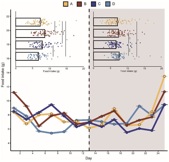Change in food intake of bats in different groups. The playback period is represented by the dark grey box. A represents the noisy-calls playback group, B represents the tonal-calls playback group, C represents the white-noise playback group, and D represents the control group. The bar chart shows the results of the Kruskal–Wallis test, and the data are presented as mean ± standard error of the mean. * means p < 0.05, ** means p < 0.01, and *** means p < 0.001.