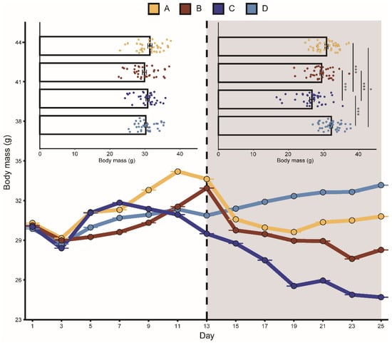 Change in body mass of bats in different groups. The playback period is represented by the dark grey box. A represents the noisy-calls playback group, B represents the tonal-calls playback group, C represents the white-noise playback group, and D represents the control group. The bar chart shows the results of the Kruskal–Wallis test, and the data are presented as mean ± standard error of the mean. * means p <0.05, and *** means p < 0.001.