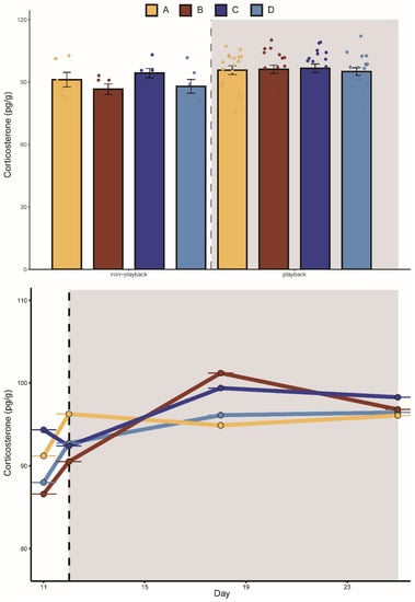 Change in corticosterone concentration of bats in different groups. The playback period is represented by the dark grey box. A represents the noisy-calls playback group, B represents the tonal-calls playback group, C represents the white-noise playback group, and D represents the control group. The bar chart shows the results of the Kruskal–Wallis test, and the data are presented as mean ± standard error of the mean.