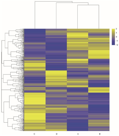 Based on the screening criteria, a total of 519 DEGs were identified in the six comparisons: group A vs. B, group A vs. C, group A vs. D, group B vs. C, group B vs. D, and group C vs. D (Table 2). The highest number of DEGs was detected in the group A vs. C comparison with 192 genes, followed by the group B vs. C comparison with 159 genes. In the group A vs. B comparison, the number of DEGs was the lowest, with 45 genes. This result suggested that the playback of the two aggressive calls differed in their effects and noisy calls exerted a greater effect than tonal calls. The hierarchical clustering heatmap of the 519 DEGs showed that there were significant differences in gene expression of the kidney tissues obtained from different groups (Figure 5).