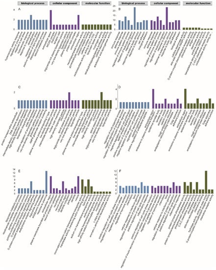 In addition, functional-enrichment analyses, including GO and KEGG, were performed to identify which differentially expressed genes (DEGs) were significantly enriched in GO terms and metabolic pathways at p-values of ≤0.01 []. GO functional enrichment and KEGG pathway analyses were carried out by Goatools (https://github.com/tanghaibao/Goatools) (accessed on 21 June 2022) and KOBAS (http://kobas.cbi.pku.edu.cn/home.do) (accessed on 10 July 2022) [].
