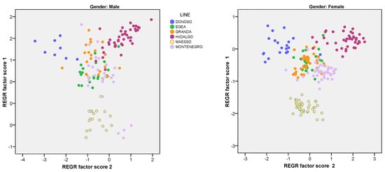 Figure 1 shows the graphic representation of males and females analyzed in the two-dimensional space generated by the two main components, according to their factorial scores using the Regression method. Groupings in the different lines can be seen, which are more clearly differentiated in females than in males. The Donoso line was located separately from the other genetic lines.