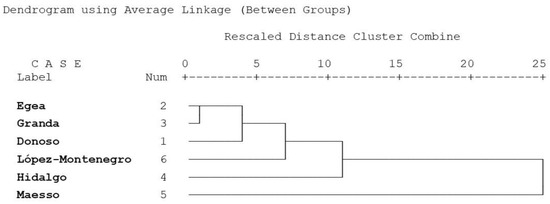 The dendrogram showed how Egea and Granda were the closest lines according to the morphometric characterization, while Maesso appeared as the family most distant to the other genetic lines as regards corporal conformation (Figure 2). Intermediate levels of proximity appeared in the Donoso, López-Montenegro, and Hidalgo lines, with Hidalgo being the farthest within the intermediate group.
