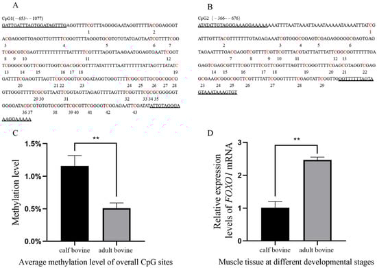 Study on the DNA methylation level of the FOXO1 gene promoter. (A,B) CpG islands in the FOXO1 promoter region (CpG1: −653 to −1077; CpG2: −366 to −676). CpG sites and primer sequences on CpG islands (marked by underlining), where CpG1 and CpG2 contain 43 and 29 CpG sites, respectively. (C) Histogram of total methylation levels. Total methylation levels in CB and AB groups were significantly different (p < 0.01). (D) The mRNA expression levels of FOXO1 in muscle tissue at different developmental stages were significantly different (p < 0.01). Two asterisks (**) indicate significant differences (p < 0.01).