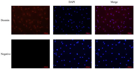 The results of indirect immunofluorescence analysis of myoblasts’ purity were applied with anti-Desmin (red, 1:200, Bioss, Beijing, China), and the nuclei were counterstained with DAPI (blue) (scale bar, 100 μm).