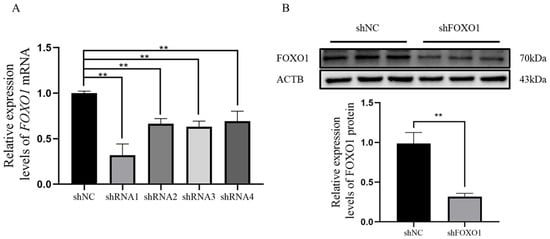 shRNA interference efficiency assay. (A,B) The qRT-PCR and Western blot assay for interference efficiency of FOXO1 shRNA. Two asterisks (**) indicate significant differences (p < 0.01).