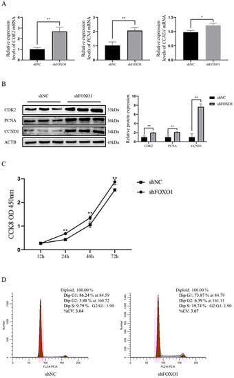 The effect of shFOXO1 on the proliferation of myoblasts. (A) qRT-PCR to determine the expression of CDK2, PCNA, and CCND1 mRNA in the shFOXO1 and shNC groups. (B) Western blot to detect the expression of CDK2, PCNA, and CCND1 protein in the shFOXO1 and shNC groups (greyscale analysis). (C) CCK-8 assay was used to detect the proliferation of transfected cells. (D) Flow cytometry was used to determine the DNA content of myoblasts 48 h after transfection. An asterisk (*) indicates significant differences (p < 0.05), and two asterisks (**) indicate significant differences (p < 0.01).