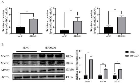Effect of shFOXO1 on myoblast differentiation. (A) qRT-PCR to determine the expression of MYOG, MYOD, and MYHC mRNA in shFOXO1 and shNC groups. (B) Western blot to detect the expression of MYOG, MYOD, and MYHC proteins in shFOXO1 and shNC groups (greyscale analysis). An asterisk (*) indicates significant differences (p < 0.05), and two asterisks (**) indicate significant differences (p < 0.01).
