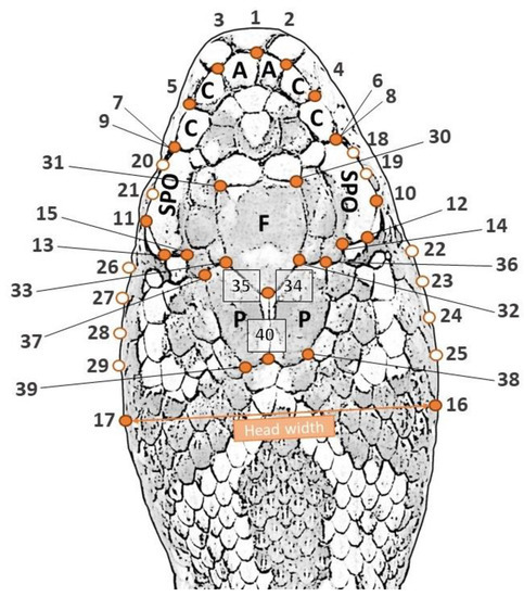 To quantify the variations in head shape and size, we applied geometric morphometrics (GM) on high-resolution photographs of a dorsal view of the head. Twenty-eight fixed landmarks and twelve semi-landmarks were modified based on those previously used by [23] for Vipera seoanei. Specifically, fixed landmarks were added in the posterior and anterior corners of the frontal and parietal scales to provide more detail for the dorsal head shape and scalation variability, since these scales are rarely fragmented in V. ursinii (i.e., contrary to V. seoanei, for which these landmarks are not confidently available). These landmarks (Figure 1; Table 1) were digitized for each specimen using the program tpsDig2 [44], resulting in 40 pairs of x–y coordinates. After data acquisition, a Generalized Procrustes Analysis (GPA) [45,46] was applied in order to standardize the size, location and rotation effects and to preserve only the information related to shape, as implemented in the function gpagen of the geomorph R-package [47,48]. The positions of the semi-landmarks were optimized during the GPA superimposition by minimizing the bending energy [49]. This provided Procrustes residuals (shape variables) and an estimate of the size of individual landmark configurations represented by the centroid size (CS). Since asymmetry was not the focus of interest of this study, and it could affect the heritability inferences, a new perfectly symmetric landmark configuration was computed for each specimen by averaging the positions of all landmarks across the midline [4,50] using the function bilat.symmetry of the geomorph R-package. Finally, a principal component analysis (PCA) was carried out on the variance–covariance matrix of the landmark coordinates, and individual scores of the first 15 PCs were used as shape variables (due to technical limitations related to multivariate quantitative genetic analyses, i.e., in the maximum number of variables that VCE-6 can handle).