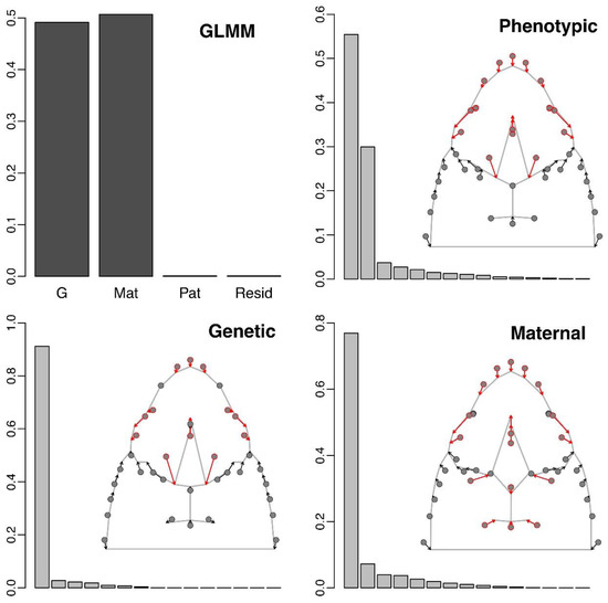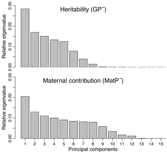 The analysis of the relative contribution of the additive genetic, maternal and paternal effects in explaining the total phenotypic variance showed that these components represent 49.13%, 50.69% and 8.85 × 10−4%, respectively (Figure 2). That is, the additive genetic and maternal components together explained almost all of the phenotypic variance included in our dataset, with very similar contributions between them, while the contribution of the paternal effects was negligible and was not considered any further. Examination of the eigenvalues of the corresponding covariance matrices indicated that the total phenotypic variation is concentrated in a few dimensions, with the first six eigenvectors concentrating over 95% of the total variance (Figure 2). This effect was much more prominent for the genetic and maternal matrices, where the first eigenvector summarized 91.21% and 76.98% of the variance, respectively (Figure 2). Examination of the principal eigenvalues of the GP− and MatP− matrices indicated that the proportion of genetically inherited and maternally determined phenotypic variations was rather spread out through several shape dimensions, where the first five components cumulatively captured 86.43% and 63.31% of the variance, respectively (Figure 3).