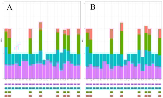 Relative synonymous codon usage (RSCU) of P. brasiliensis (A) and L. canadensis (B). The x-axis represents the amino acids encoded by the codon, which is listed beneath each amino acid. The RSCU values are listed on the y-axis.