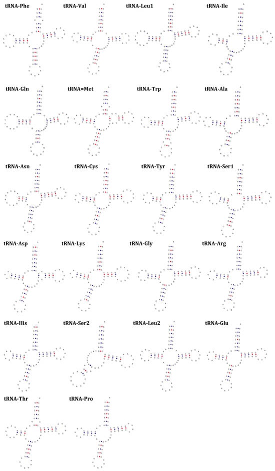 The online software tRNAScan-SE 2.0 was used to predict the tRNA gene structure [] (http://lowelab.ucsc.edu/tRNAscan-SE, accessed on 30 July 2022).
