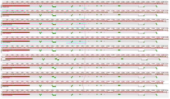 Gene arrangement comparison of the 11 species selected in this study with Mauve. PCG is in the white block, 12S rRNA and 16S rRNA are in the red block, and tRNA is in the green block.