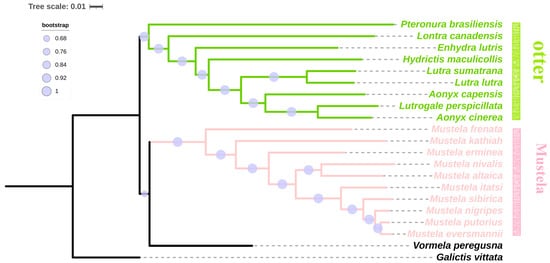 A total of 13 different protein-coding genes (PCGs) from the 21 mitochondrial genomes were retrieved and combined into a single sequence, named 13PCG. We chose only 13PCG for phylogenetic analyses because the PCG evolutionary rate was more suitable for phylogenetic analyses than that of the other regions of the mitochondrial genome sequences. The combined sequences 13PCG were aligned with MUSCLE v3.8.31 []. The optimal model (GTR + G + I) was selected using the model finder function of PhyloSuite software (V 1.2.2) []. Bayesian inference (BI) was subsequently used to infer the phylogenetic relationships of these 21 species (Table S1). BI was conducted with MrBayes [] using the Markov Chain Monte Carlo (MCMC) algorithm, running for 2,000,000 cycles (sampling one tree every 1000 generations). Vormela peregusna and Galictis vittata were selected as the outgroups. Using the Interactive Tree of Life (ITOL) website, the derived BI tree was visualized [].