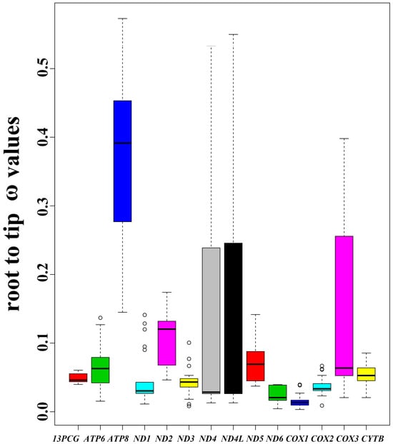 The molecular evolution rate (root-to-tip ω values) of 13 protein-coding genes (13PCG) and each PCG.