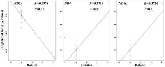 Phylogenetic independent contrast analysis between different habitats and root-to-tip ω values (Log10-transformed) on ND2, ND4, and ND4L in 21 selected species.