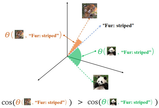 Furthermore, inspired by human taxonomists’ efficient identification of wildlife species from individual images, this paper integrates textual expert knowledge to address the few-shot problem (mentioned in Section 1). As different textual and visual modalities of knowledge need to be integrated while feeding to the classification models, we choose the vision–language model CLIP in this work. CLIP is a large pre-trained model consisting of a visual coder and a text encoder [31]. Different data types are encoded by the encoder of each corresponding modality and then connected through a simple cosine dot product calculation to establish a similarity relationship [31]. In particular, CLIP is obtained by pre-training on 400 million “image–text pairs”. This means that, on one hand, the CLIP model contains a huge amount of knowledge and, on the other hand, it becomes almost impossible to fine-tune it directly with a small number of samples. Therefore, we fixed CLIP and fine-tuned an additional lightweight network to use it. This incorporates text-based expert knowledge and also utilizes the large amount of prior knowledge embedded in CLIP. As shown in Figure 1, the trained CLIP model can help us calculate the similarity scores between text-based expert knowledge (e.g., fur:striped) and the image samples of the test species, which can help us recognize the species. Crucially, it is also possible to adapt CLIP to real-world scenarios of endangered and rare wildlife monitoring by training this extra network with fewer samples and lower computational cost. The details will be introduced in the following sections.